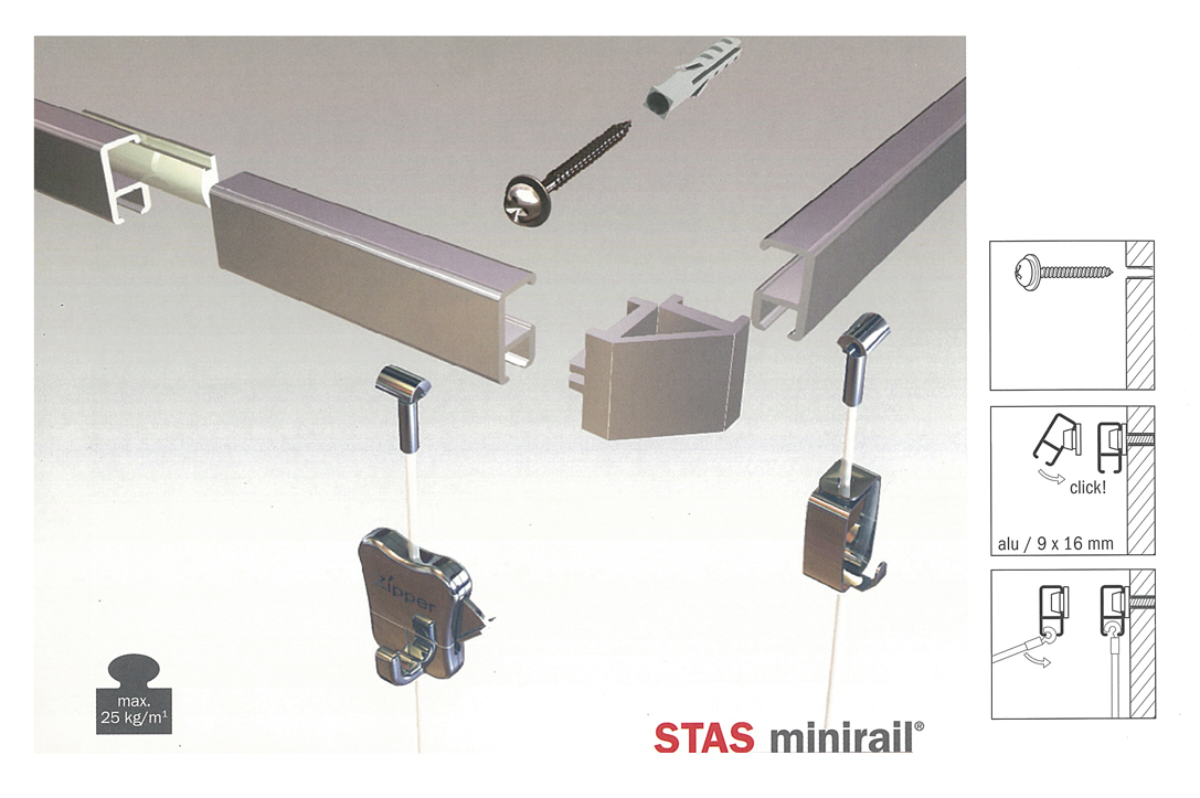 The patented STAS minirail system is the thinnest and most innovative picture hanging system in the World. the rail, which is available in white or a natural aluminium colour, is only 16 mm wide and perfectly blends in your interior. The STAS minirail system is very easy to use. Fitting, using the specially developed STAS minirail clipscrew, couldn’t be simpler.